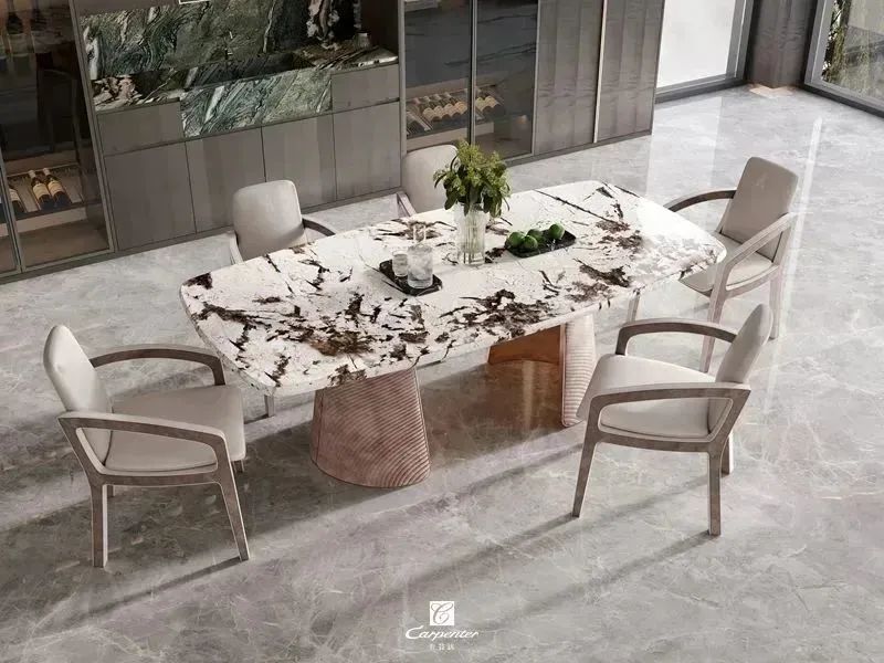 設(shè)計(jì)師通過材質(zhì)選擇、色彩運(yùn)用和軟裝搭配,演繹高級(jí)輕奢風(fēng)。注重空間與功能的結(jié)合,餐邊柜、酒柜及餐桌椅井然有序、整齊劃一,滿足用餐、收納、展示等多重需求。