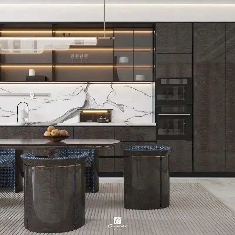 深棕色亮光的定制柜、金邊點(diǎn)綴的餐桌椅、間隔使用的玻璃門,細(xì)節(jié)中透露著浪漫,打造高級(jí)精致的輕奢風(fēng)餐廳,營(yíng)造情調(diào)十足的用餐氛圍,用餐也自帶精英范兒。
